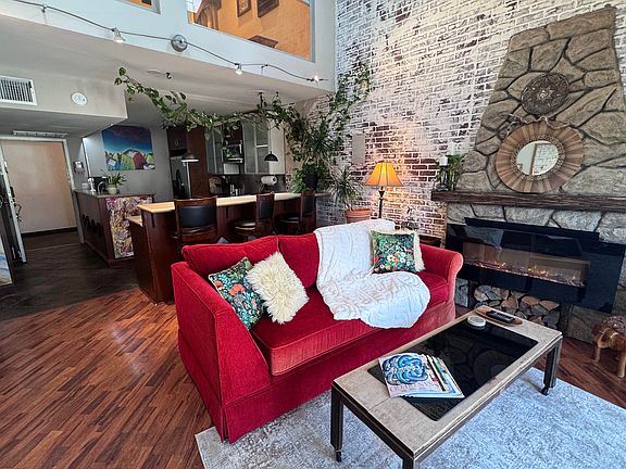 1 BD/ 2 BA, real plants (no plastic succulents here), creates warmth to the open-concept floorplan. Brick facade w/ electric fireplace, high ceilings, skylights, tile & wood floors, wall-to-ceiling windows for great natural light overlooking the pool deck. Blackout drapes & blinds. Fully equipped kitchen, bathtub & dual head shower.