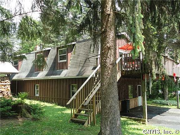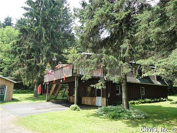 Unique home with very private setting. Main living area on second level features great room with country kitchen & custom made cupboards, dining area, large living room plus two bedrooms & full bath. Sliding doors lead to 2nd level deck. First level has 2nd kitchen, plus bonus space for storage, bedroom, laundry & 2nd bath. Located on total of 17 acres, some woods & some cleared. Greenhouse attached to garage plus shed. Also includes 9.50 acres-tax map#113089-046.000-0003-002.000.0000-Town of Homer. Great spot for someone who loves country & privacy!