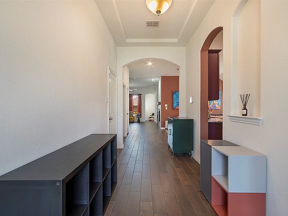 Welcome to 6114 Sutton Fields Trail, a beautifully maintained single story home with 3 bedrooms, 2 full baths, a private study, and 1,873 square feet of open living space. The inviting layout features tall ceilings, upgraded tile flooring, and a bright family room that flows into the gourmet kitchen with granite countertops, stainless steel appliances, gas cooktop, walk in pantry, and oversized island. The private primary suite offers dual vanities, soaking tub, separate shower, and a large walk in closet. Secondary bedrooms are generously sized with a shared bath, and the study adds flexibility for a home office or flex room. Thoughtful design touches include custom wallpaper by Roma Osowo and a striking wall mural by Trey Wilder, creating a truly unique style. Enjoy a covered patio and large backyard, perfect for entertaining, pets, or play. Located in Prosper ISD, Sutton Fields offers resort style amenities including swimming pools, basketball courts, tennis and pickleball courts, playgrounds, pocket farms, and scenic ponds. Families will appreciate having Dan Christie Elementary within walking distance and a nearby school bus stop, with quick access to the Dallas North Tollway for shopping, dining, and entertainment.