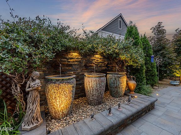 The outdoor space is a private paradise designed for ultimate relaxation. The covered patio is fully equipped with a built-in gas fire pit and a soothing fountain, creating the perfect escape from the everyday. This tranquil setting provides a peaceful backdrop for unwinding or hosting intimate gatherings.