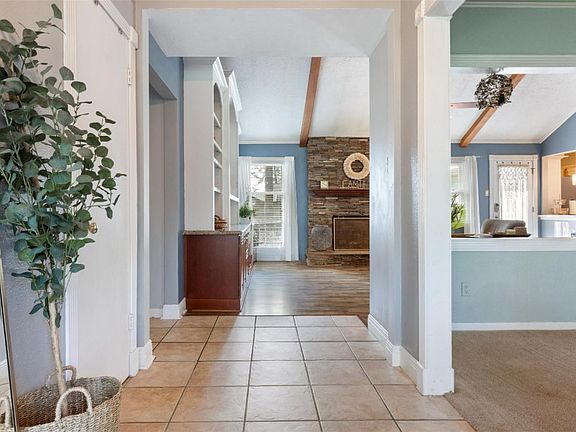 Stone gas fireplaceGas cookingStainless steel appliancesCustom built-insBuilt-in ovenInviting floor planFormal dining