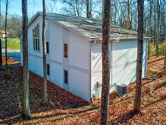 Custom designed mid-century architectural style home, situated on a beautiful wooded mature rolling typography treed lot. A haven in the woods ... reminds one of a Brown County cabin home. Up the wooden stairs to the entry. Enjoy the expansive upper level deck overlooking the peaceful private wooded lot. Home is ready for your updating tastes. Front door entry into a large Living Room with a vaulted ceiling and a large picturesque windows and much natural lighting. An artists delight. Dining Area flows into the Living Room. Galley type Kitchen with a skylight and walk-in pantry. Nice size Primary Bedroom with Primary Bathroom with a large walk in closet. Two additional Bedrooms on the upper level and a Hall/Guest Bathroom. Laundry Room with washer and dryer (both included in the sale) on the upper level. Lower level with a 4th Bedroom/Den/Office, and an adjacent space with plumbed-in piping for a 3rd Bathroom. Large recreation/workout/play area on the lower level, and Workshop area. Two car-attached Garage with access to the lower level. Home is located close to the Fall Creek Trail.