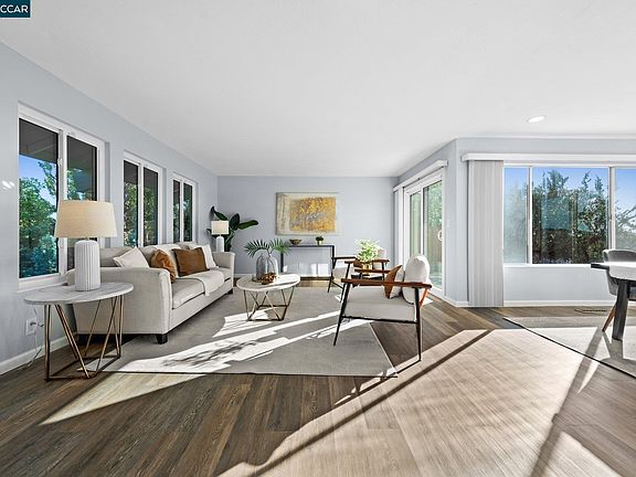 This stunning home offers Spectacular, Panoramic Views of the San Francisco Bay. A Must See location! Views from every room! The abundance of natural light highlights the spacious primary bedroom suite, and the new Gourmet Kitchen features top of the line appliances including a 36 inch professional duel fuel range perfect for culinary enthusiasts. The spacious kitchen opens to a family room with a natural stone, gas fireplace capable of heating the entire downstairs area. The kitchen and bathrooms feature luxurious quartz countertops and the laundry room is equipped with a new washer and dryer. The primary bath boasts a soaking tub and shower combo. The other two bathrooms feature extra large showers with zero thresholds. LVP flooring throughout looks and feels like wood but easier to clean and maintain. The Trex deck extends the length of the house providing ample space for entertaining, grilling, relaxing or enjoying the beautiful views. Walk to Greenridge park nearby and enjoy hiking trails, Lake Chabot and all the beauty this area offers. There's an easy commute from the 580 to the South bay, Fremont, Oakland and San Francisco. The highly rated schools greatly support education and the arts. With fresh paint and a beautifully landscaped front yard this home is move in ready!