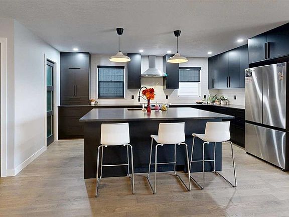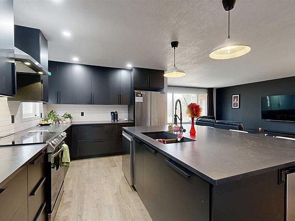Welcome to this beautiful 4-level split home on a 0.22-acre lot near the edge of town — offering privacy, modern comfort, and a great family lifestyle. With no residential neighbors in front, you can enjoy peaceful surroundings while still being close to everyday conveniences. Step into the spacious front entrance that opens into a bright, open-concept main level with beautiful, real hardwood flooring. The living room has plenty of room for family gatherings, with a large front window that brings in natural light. The kitchen stands out with its bold, modern design — featuring sleek cabinetry, stainless steel appliances (including a wine fridge and vent hood), a pull-out coffee bar, and pantry. It flows seamlessly into the dining area, where garden doors lead to a covered deck perfect for family barbecues and summer evenings outdoors. A cement patio extends along the back of the home, creating even more space for entertaining. Upstairs, you will find three comfortable bedrooms and a modern 4-piece bathroom with custom tile and a stone countertop. One level down, the spacious family room has a fireplace and built-in wall cabinets with display shelving and lighting. This space offers endless possibilities — from a home theatre for entertaining to a cozy retreat, A second bathroom with tiled shower and pedestal sink also serves as a laundry area with front-load washer and dryer. The lowest level adds even more flexibility with two additional rooms that can be used as bedrooms, a home gym, craft space, or office — perfect for a growing family or guests. The front yard offers great curb appeal with a cement driveway leading to the attached single car garage, complete with shelving and a full wall of pegboard to keep everything neatly organized. Mature trees provide natural shade and privacy, while flower beds add a welcoming touch of color and charm. You will love the large fenced backyard with mature trees, a fenced-in raspberry patch, garden area, and extra garage with more parking at the back. This home is located in a welcoming neighborhood with a playground and community garden just down the street. The walking path across the street leads to retail shops, restaurants, and the mall — everything your family needs, just steps away. A modern, move-in ready home designed for family living — with space to grow, play, and relax.