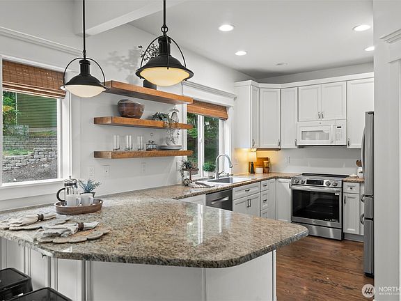Modern comfort meets everyday convenience! This 2,028 sq ft home has 3 bedrooms + office (or 4th bedroom), 2.5 baths, on .44-acre. The open-concept kitchen features floating shelves, stainless steel appliances, and a seamless flow to two dining and living areas. The primary suite includes a gas fireplace, walk-in closet, soaking tub, and updated vanity. Private deck view deck, perfect for morning coffee. Outdoors, relax on the patio, soak in the hot tub, and enjoy garden space. Updates include a new roof. House is wired for a generator, RV, sauna and hot tub. Private yet close to Lake Stevens shopping, and more, with a 2-car garage.