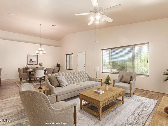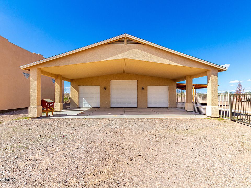 Do you need more garage space? This home is for you! This single level home offers nearly 2,200 sq ft of living space, 2 garages capable of holding up to 11 vehicles (climate controlled), additional covered parking for 5 vehicles & an acre of land! There are 3 large bedrooms with a den that could easily be a 4th bedroom if needed. Throughout you will notice tall ceilings (vaulted in the main spaces & 9' everywhere else), Tile/ Laminate wood floors (no carpet), neutral paint, 2'' faux wood blinds & ceiling fans in every room. The kitchen features oak cabinets & newer appliances (fridge included). The primary suite is HUGE & offers double sinks, renovated shower & large walk-in closet. Outside there are several covered patios overlooking your 1 acre lot. Mature trees, fenced yard & plenty of room for your horses, future pool, guest house or whatever you want to make it! The detached garage was built to match the house & is climate controlled. It offers plenty of LED lights, 100amp sub panel, lots of outlets (including 220 for your electric car, RV or welder), there is also water at the exterior of the building. There are 3 garage doors ranging 8' to 10' tall & interior ceiling height over 12' in some places allowing you to install car lifts or park an RV. Energy efficient items include sunscreens around the exterior windows & solar for lower electric bills! Tremendous value! 6,302 sq ft under roof (2,178 sq ft living space, 1,692 sq ft garage space, 1,282 sq ft carport space & 1,150 sq ft of covered patios), a home built in 2008 & an acre of land. Come purchase your slice of paradise today!