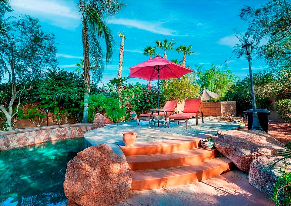 Detached casitaGas-log fireplaceTowering rock waterfallsCenter islandLarge private courtyardSumptuous bathExpansive courtyard