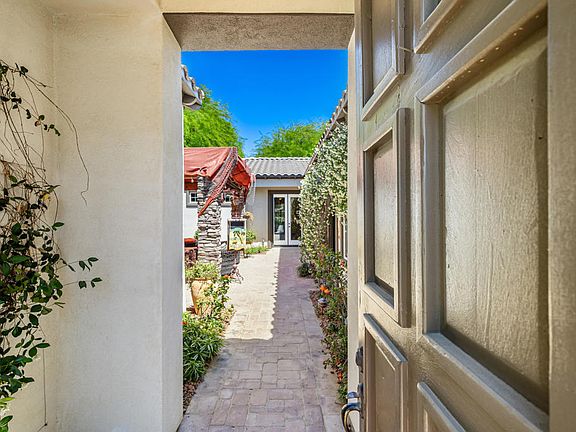 Once upon a time is the way this storied Trilogy at La Quinta property begins. An adult playground of grand scale hidden behind a tall wooden door is a home purposefully designed for the joy of living large. At 2,789 SQ FT, this rare four-bedroom, four-baths Mesquite model home with two-car and separate single car garages, has at its center a large private courtyard with separate doors to the main home, a detached Casita with kitchenette and full bath, and a separate attached Casita, also with a full bath. The exquisite primary bedroom retreat has direct access to the courtyard, and to a private covered back patio. The double-door entry, tray ceiling and room size is outstanding, but the highpoint is a sumptuous bath featuring two separate vanity stations covered in marble and each with walk-in closets, a king-size marble shower with two shower heads and bench seat, and a dreamy soaking tub. Inside, the home is open with ten-foot ceilings, crown molding and tile floors in the main living areas. The great room has custom built-ins, and TV with surround sound in the ceiling and a gas-log fireplace to curl up by while reading or binge watching your favorite shows. The kitchen is outfitted with premium stainless steel appliances, six-burner cooktop, double-oven, and dishwasher. A center island with pendant lighting, abundant cabinetry, built-in pantry and smooth granite slab countertops with stone backsplash makes cooking pure joy. Special occasions call for a formal dining room, and this one is spacious and inviting. The large office area with wine-storage is also usable as a flex space for crafts, wine-room, cafe or anything else your heart desires. The expansive courtyard has seating for large gatherings, and the beautifully crafted pergola adds a filtered cover for year-round comfort. Come fall and winter everyone will enjoy gathering around the raised gas lava-stone firepit while cheering on their favorite teams on the outdoor big screen TV. On warm days, life outside stays comfortable with a Kool Fog misting system that envelops much of the home's exterior in a fine cooling mist. Adjacent to the courtyard, surrounded by exquisite pygmy palms and tropical flora, is a spectacular resort-style Pebble-Tec salt water pool with towering rock waterfalls cascading over three-tiers into the spa and pool below. At the far end of the pool is a raised deck to relax and take in the views, or as a stage to dance the night away.