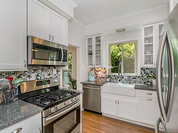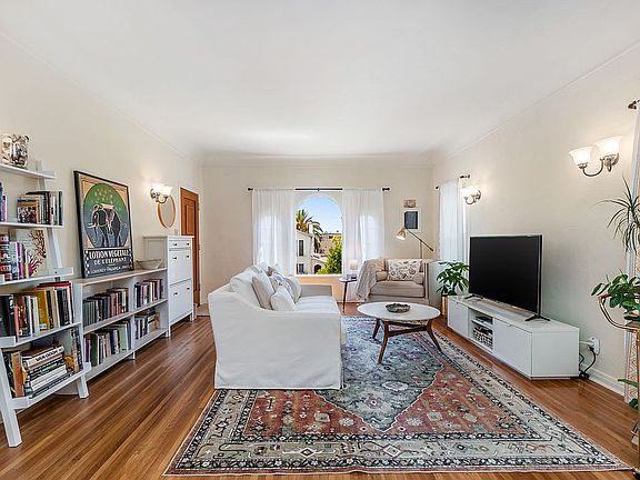 Rare offering: Vintage charm abounds in this top-floor unit of a small complex in a classic Spanish architecture building on a tree-lined street. Original hardwood floors, newer dual-pane windows, high cove ceilings, and an abundance of natural light. 1920s details throughout, including sconce lighting, phone nook and casement windows. Extensively remodeled kitchen features stainless steel appliances, quartz countertops, farmhouse sink and white shaker cabinetry. Closet custom-built-ins leverage ample vertical space. Updated bathroom combines mid-century modern details with original blush pink ceramic tile. Extremely quiet building, perfect for WFH. Laundry room has stacked washer/dryer and original wall-mounted ironing board cabinet. Rear door allows access to common indoor storage area with steps leading down to a shared outdoor space and detached private garage. Centrally located, Beverly Hills adjacent, with easy access to The Grove, West Hollywood and Culver City.