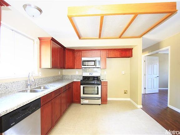 Beautifully remodeled home with new laminate wood flooring on 1st floor and new carpet on 2nd. Home has a functional open floor plan with a bedroom downstairs and 3 upstairs. Kitchen is updated with granite countertops and new cabinets along with SS oven/microwave/dishwasher. Huge backyard with 2 storage sheds along with balcony and jetted tub in master bed. RV parking on side. Central heat and A/C! MOVE IN READY!
