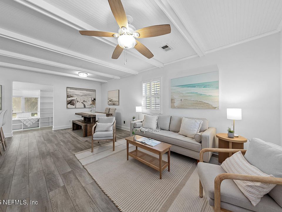 Move in ready and ideally located to enjoy the best of beachside living! ! Formerly a 2BR/2 Bath, this property has been beautifully reimagined and renovated into a spacious 3 BR/2 Bath residence. Located just 5 blocks from the beach, you'll find LVP floors and plantation shutters throughout, a cozy light filled living area, beautifully updated bathrooms and a modern kitchen with newer appliances and a custom island with additional drawers for storage. Step out back to enjoy a fenced in, spacious backyard with an outdoor shower; ideal for relaxing after a day at the beach or entertaining friends. Don't miss this opportunity to live at the beach at an affordable price!