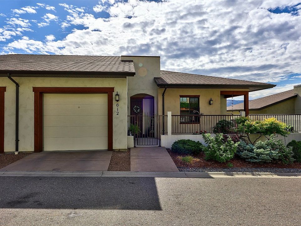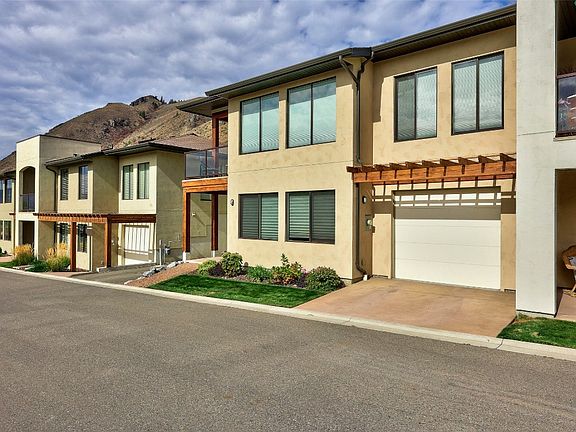 Welcome to Belmonte Gardens, a highly desirable Tuscan-inspired community in Sun Rivers. This level-entry, south-facing townhouse is filled with natural light and offers an open-concept design that seamlessly connects the kitchen, dining, and living areas, perfect for entertaining or everyday living. The kitchen features custom wood cabinetry with built-in lighting, quartz countertops, an island with extended seating, a gas stove, and a pantry with custom shelving. The spacious primary suite includes a skylit ensuite with double vanity, heated floors, and a walk-in closet with the convenience of in-suite laundry. A versatile den/office and powder room complete the main floor. Enjoy two outdoor spaces on this level: a covered deck with sweeping city and mountain views, and a private gated courtyard at the front. The lower level offers a second bedroom, large rec room, 3-piece bathroom, oversized storage, access to a second single garage, and a third outdoor patio area. Additional highlights include geothermal heating, central A/C, heated bathroom floors, two separate garages (ideal for his & hers, extra storage, or a golf cart), gas BBQ hook up and proximity to visitor parking. Just minutes from downtown Kamloops, championship golf, dining, and walking trails. An excellent fit for professionals, downsizers, families, or snowbirds.