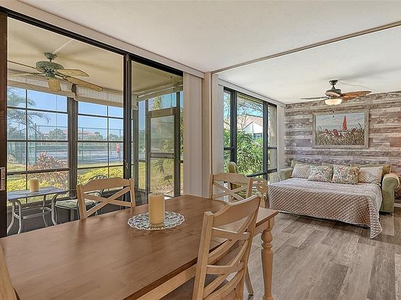 This fully renovated first-floor corner residence offers one of the most desirable locations in the community. The ground-level setting allows direct access without stairs or elevators and provides the shortest distance to the community center, which includes a pool, fitness facility, pickleball and tennis courts. The two-bedroom split floor plan enhances privacy, with each bedroom featuring an en-suite bath. A retractable wall in the guest bedroom allows flexible use of the space. The updated kitchen features solid wood cabinetry, stainless steel appliances, and generous counter space with room for breakfast table. The open great room accommodates dining and living areas and extends to a west-facing covered patio, ideal for morning coffee or evening relaxation. A new HVAC system was installed in 2023. Bird Bay offers resort-style living near downtown Venice. The community amenities include a clubhouse, pool, fitness center and courts for tennis, pickleball, shuffleboard and bocce. Seasonal activities include yoga classes, art shows and social gatherings. Access to the Legacy Trail, a popular destination for cyclists, runners and walkers, is less than a quarter mile away, providing a direct route to Venice Island. Venice Beach and Nokomis Beach are within three miles, offering opportunities for swimming, shell collecting and shoreline walks.