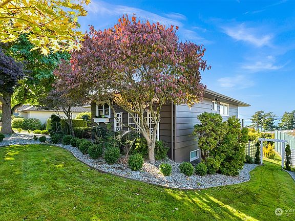 This Mid-century Transitional Bay-Island View Edgemoor residence, a blend of charm, comfort and style has utmost privacy. Meticulously maintained, welcomes you into a beautifully designed living space with an open floor plan seamlessly connecting the living, dining, and kitchen areas, opening to a wraparound deck with breathtaking views and ever changing sunsets. Main floor primary Bay view bedroom with ensuite bathroom. 2nd main floor guest bedroom + guest bathroom. 2 fireplaces. Lower level is versatile with a large family room plumbed for a wet bar, laundry room, 3rd bedroom with French doors leading to a patio, a 3rd full bath and office. Easy access to Historic Fairhaven, Waterfront and Ferry Terminal. First time on market in 44 years.