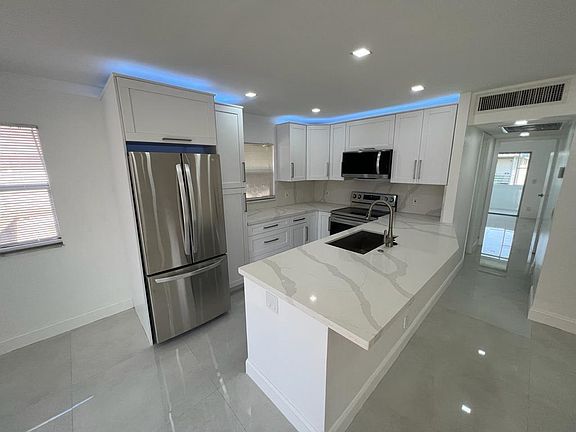 STUNNING RENNOVATION! This beautiful 2 bedroom apartment is located in the best part of Kings Point; steps to the clubhouse, restaurant, and tennis and pickle ball courts, and pool!!! The apartment features two spacious bedrooms, each with plenty of natural light and ample closet space. The living room is bright and airy, with a large window. Kitchen boasts BRAND NEW appliances and beautiful white cabinetry, plus quartz countertops and backsplash. Added pantry cabinet. No detail was overlooked in this beautiful remodel. Neutral color palette to suit any decor style desired. New washer and dryer; electrical panel; water heater. All ceramic oversized tiles throughout; and two tastefully renovated bathrooms with frameless glass shower enclosures.