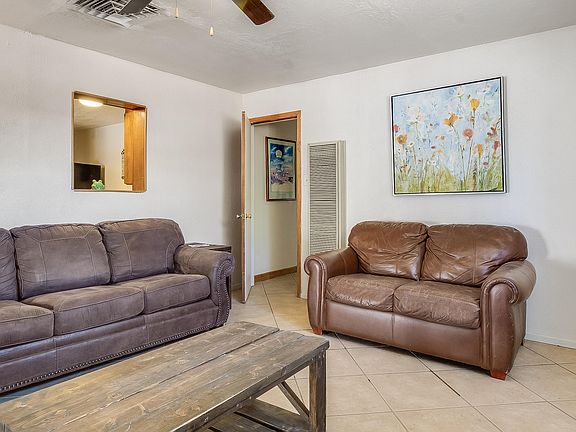 Successfully used as furnished rental for $2300/month including utilities. Owner will consider selling furnished. Hard to find North Valley home in this price point! Located on the REAR lot, not directly on Candelaria on a .25 acre lot, this home offers many possibilities. 3 bedrooms and two baths. Pleasant kitchen and dining space. Living room with stacked stone fireplace. One bedroom with custom rock fireplace. Tile or wood floors throughout . Baths have been updated with tile and one has replaced vanity top. Fenced rear yard. Covered front porch. Short distance to Garfield Middle School, Valley High School, Bettys Bath and Day Spa, the Rio Grande Nature Center and the Bosque Trails at the end of Candelaria.