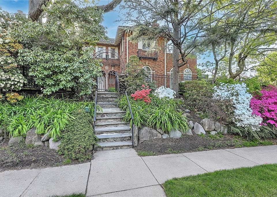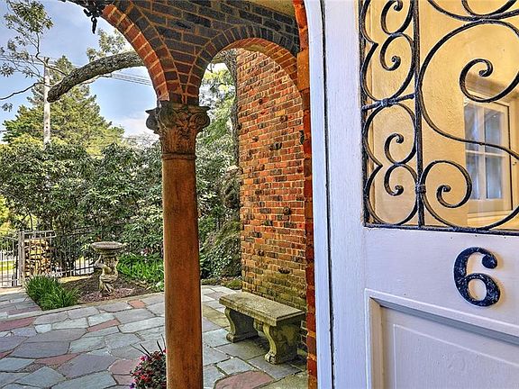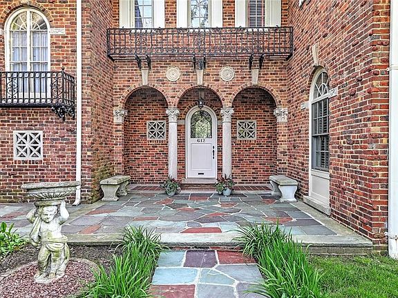 You will not want to miss this Mediterranean style Colonial Revival set on a corner lot in Upper Elmgrove. Step through the front gates onto the garden path that leads to a colonnade front entrance. Once inside you'll feel as if you've been transported to a European Villa. The imported tile floor extends from the foyer into the library with a carved stone fireplace. A great spot to telecommute. At the other end of the hall is the living room with a beamed ceiling and another carved stone fireplace that flows to the sunroom with a third stone fireplace. Up a couple of steps is a lovely dining room with a warm wood floors with a mahogany inlay and beamed ceiling. Beautiful arched windows define the first floor living space adding to the home's romantic allure. The crisp white eat in kitchen has all new top of the line appliances. A convenient eating nook is the perfect spot for enjoying casual conversation. A bedroom or den and full tile bath provide versatility. Upstairs are four bedrooms including the generous primary bedroom with dressing room and a roof top terrace. Three additional bedrooms, a large closet or dressing room and two full baths complete this level. The manicured grounds contain mature plantings and three stone patios all surrounded by brick walls with decorative wrought iron inserts. The two car garage is conveniently located at the back of the house. An easy stroll to the Farmer's market, Hope Village and city parks makes this a must see home!