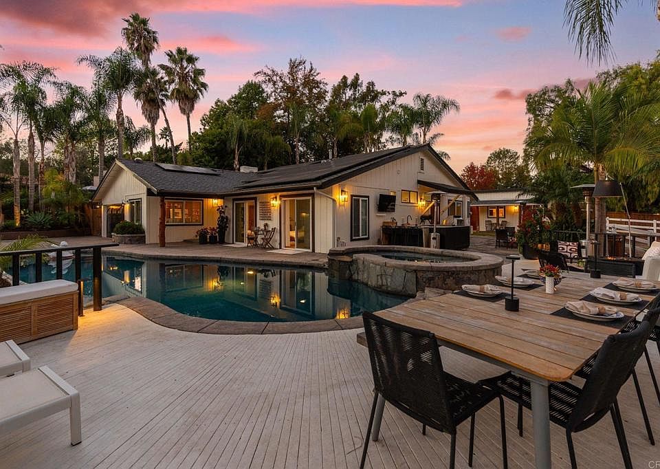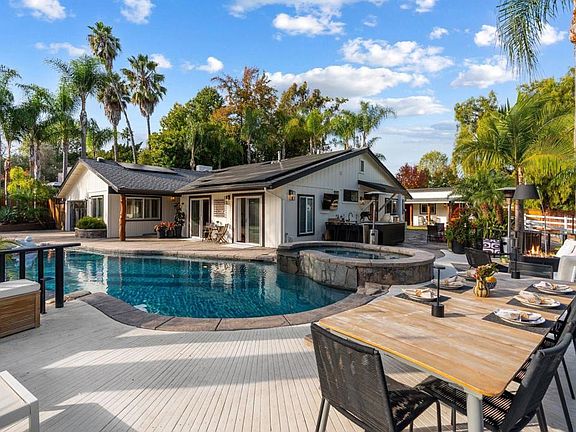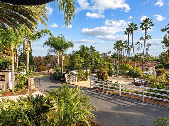 Charming, private Olivenhain home situated at the end of a small road with direct access to the bridle trail. Very private .83 acre lot with big views of the Olivenhain valley. This gated property is very versatile and features 2 bedrooms, 2 baths and a large office in the home, as well as a separate guest house with 1 bedroom and bath. In addition there is another separate detached office, an attached 2 car garage (which is currently set up as an art studio), 2 covered stalls that are open and can be used as a carport, a separate storage building and another building that would make a perfect shop or studio. The square footage, as per Assessor's office, is for the home only. The property was set up for horses by the previous owner with covered stalls, sand arena, corral, tack shed, hay storage, wash rack, etc., and could be utilized again by new owner. Gorgeous pool and spa overlooking the beautiful, serene country views. Great outdoor BBQ area adjacent to the pool with lots of decking and a firepit. Part of the arena is set up as an spacious entertaining/party zone. Amazing grounds also include an orchard with tropical fruits, citrus and stone fruit, raised garden beds and a large chicken coop and a fenced corral for animals. Direct access to miles of walking and riding trails from this home. This is a very unique and special property in the heart of Olivenhain. Owned solar electric and A/C in all living areas. OPE Elementary. No HOA or Mello-Roos.