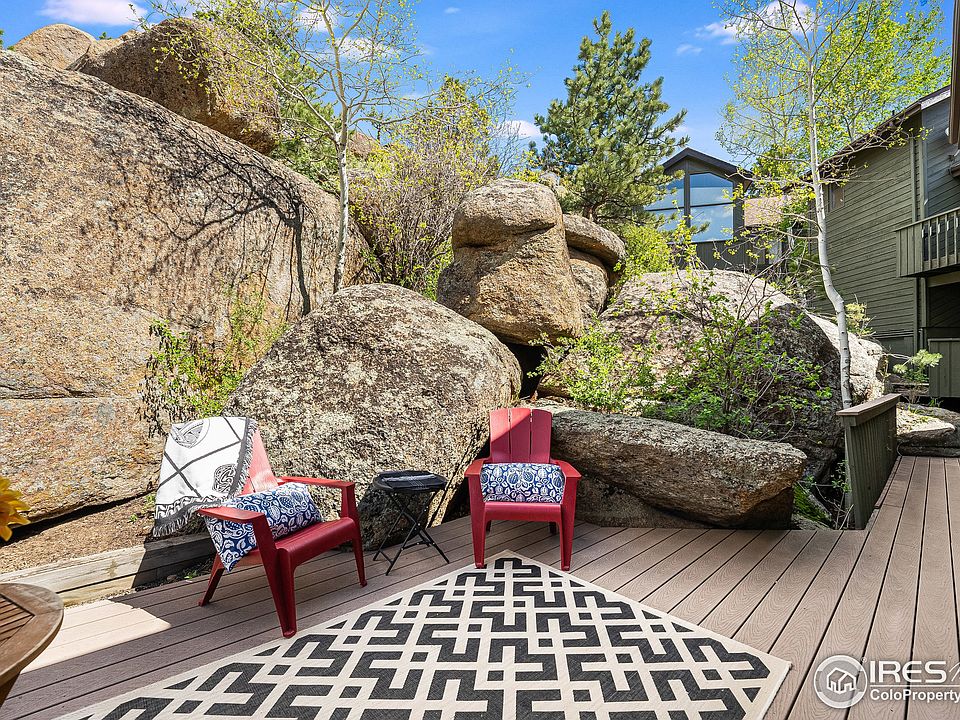 Fantastic Rock Acres Condo. Come home to this wonderful condo w/ great views of Longs Peak. Sit on the deck surrounded by huge Boulders. Cozy wood-burning fireplace in the vaulted-ceiling great room. 3 decks for enjoying the nice outdoor space and views. Easy walk to downtown and access to Rocky Mountain National Park, Fly fishing, hiking, biking, wildlife viewing, & peace & quiet. Comes furnished and ready to enjoy Summer in Estes!.