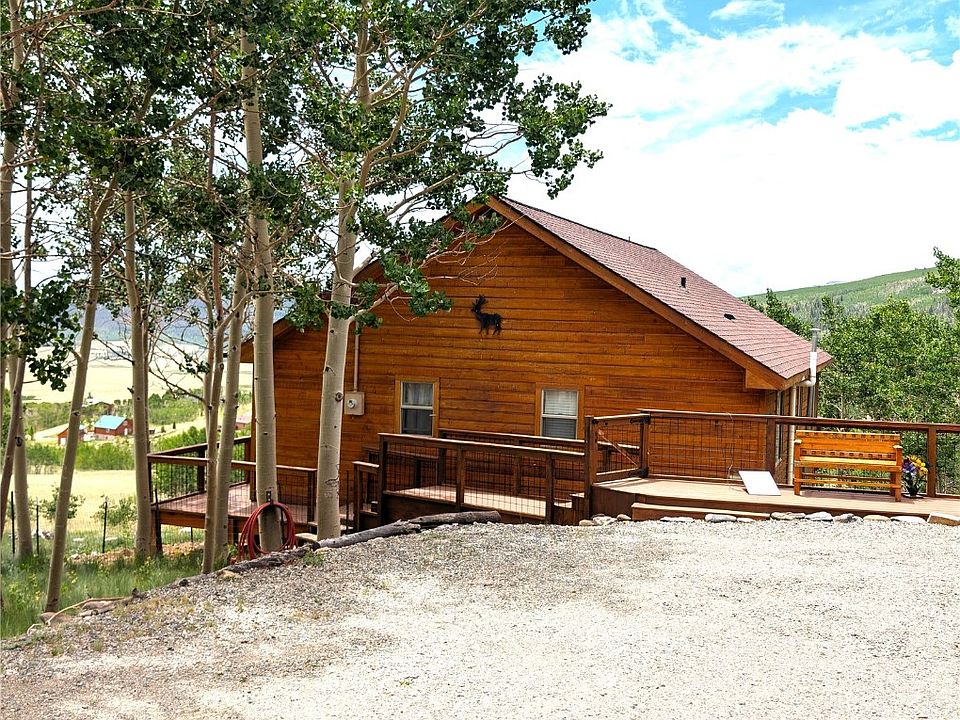 Welcome to your Colorado mountain escape! Tucked away on 1.25 acres in the desirable Warm Springs subdivision, this charming 4-bed, 2-bath home offers the perfect blend of cozy comfort, modern updates, and unbeatable mountain views in every direction. Just 30 minutes from Breckenridge and close to all the charm and outdoor adventure Fairplay has to offer, this property is ideal as a full-time residence, vacation retreat, or short-term rental investment. Inside, you’ll be welcomed by a bright, open floorplan designed for easy mountain living. The kitchen is inviting and functional, featuring modern appliances and abundant cabinet space—perfect for storing everything from pantry staples to cookware and small appliances. The main level flows effortlessly from the kitchen to the dining area and living room. Just off the dining space, step out onto the wrap-around deck, where you can sip morning coffee, entertain guests, or unwind while taking in the panoramic mountain views. This level also features two sun-filled bedrooms and a full bathroom, providing convenient accommodations for guests. You'll also enjoy radiant floor heating in the kitchen and bathrooms. Downstairs, the walk-out basement boasts the primary suite with bathroom, plus an additional bedroom and a separate entrance—ideal for hosting guests, multi-generational living, or generating rental income. Outside, enjoy the tranquility of your private walking path, complete with a bench where you can sit, relax, and take in the peaceful surroundings. A detached garage offers ample storage for gear, tools, or outdoor toys. Located in a quiet, friendly mountain community, this home offers easy access to world-class skiing, fishing, hiking, and local dining and shopping. Warms Springs has 7 ponds that are filled with fish and no fishing license. Whether you're seeking a mountain lifestyle, a getaway to share with others, or a savvy real estate investment, this home offers a rare opportunity to have it all.