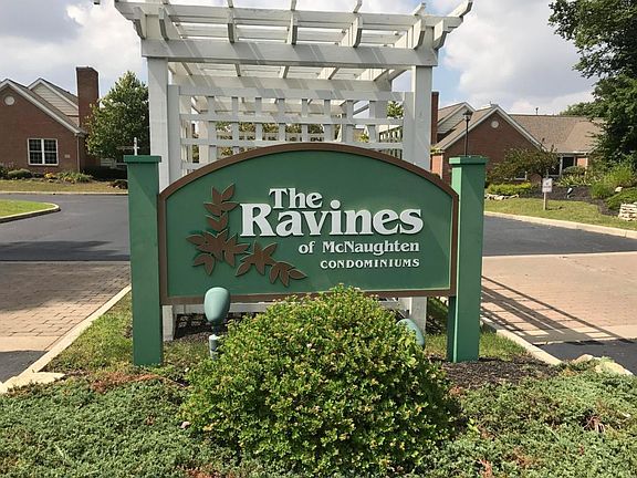 Super ranch condo in Ravines of McNaughten. Great location at the entrance of the community if security is a concern. You'll see everyone coming and going here as you sit on your front porch! Spacious condo with 2 Bedrooms, 2 full baths. Over $7k in New Rosati Windows installed in 2015. New roof on building in 2016. Nice size kitchen with ample cabinet space and eating area. Separate dining room area and living room with brick hearth fireplace. Porch could easily be screened in. Good sized utility/laundry room and big 2 Car garage. Lovely clubhouse and pool. Lots of green space in this pretty community with sitting and walking areas. Convenient location to shopping, dining and your medical needs and 270. This is a Gem!