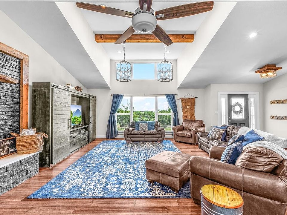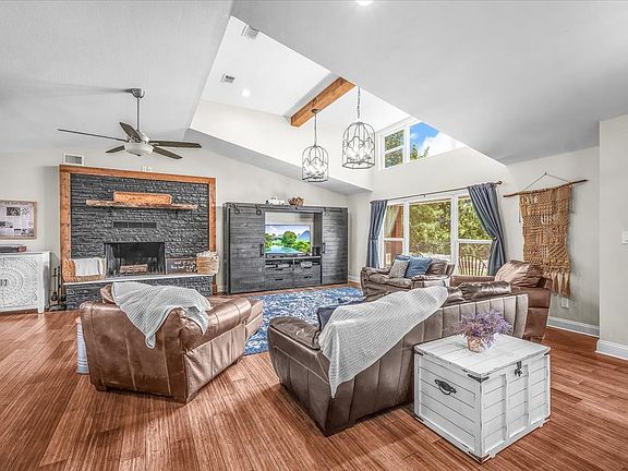 This peaceful home is filled with natural sunlight and beautiful views. Completely renovated in 2019 with brand new windows, roof, plumbing, septic, electrical and custom lighting. Split floor plan with two master suites. Primary suite has an attached room for an office or nursery. Secondary primary has an ensuite, private entrance, and personal laundry room. Large living and common areas are perfect for gatherings and spacious bedrooms make this home perfect for multigenerational living. Surrounded by organic gardens, fruit trees, and plenty of parking. You will also find a newly renovated salt water pool and pool equipment as well as a detached oversized 3 car garage with large office or flex space above. This conveniently located property is fully fenced with an automatic gate at the entrance. Walking trails across the street. Horses allowed. No HOA.