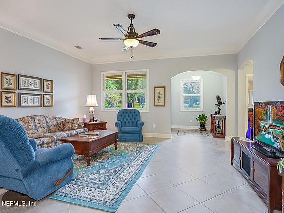 Welcome to a rare opportunity to own a custom brick estate nestled on 1.81 acres of pristine waterfront—just minutes from town and a short drive to Jacksonville. This immaculately maintained luxury home blends timeless craftsmanship with serene natural beauty. Enjoy breathtaking panoramic pond views from the master suite, kitchen, dining room, and lanai, all framed by lush landscaping that blooms year-round. Wake up to peaceful sunrises and wind down with unforgettable sunsets over the water—every single day. The home's spacious layout offers an abundance of natural light, ample storage, and seamless indoor-outdoor living. Whether you're hosting elegant gatherings or enjoying quiet evenings by the lake, this home delivers the ultimate in comfort, style, and privacy. A true hidden gem offering luxury, space, and serenity—schedule your private tour today. Features include newer roof, newer hvac, solar water heater, water softener, Custom trey ceilings, crown molding, porcelain floor Carrara tiles & marble counter tops, imported Italian mosaic glass, & 42in maple cabinets