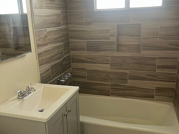 New paint and New Flooring. This is a small rear house of 2 on a lot. Patio in front. no other yard. Kitchen Includes a stove and a washer hook up. One parking space with this unit. No Pets and this is a Non Smoking unit.