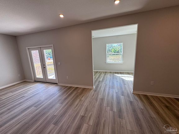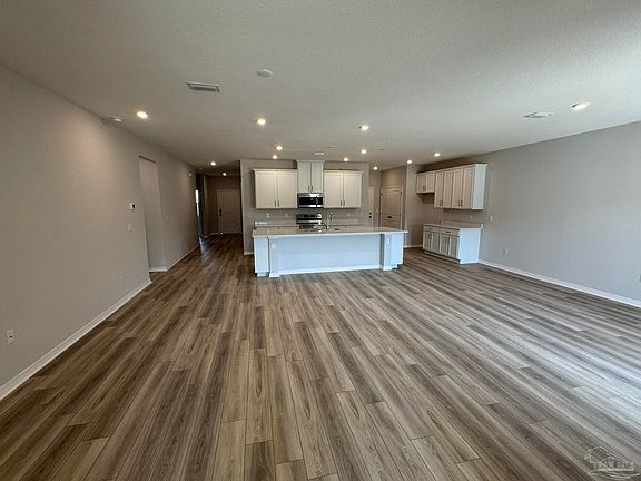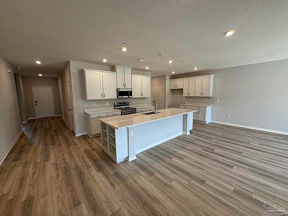 Welcome to Bellview Pointe, a peaceful neighborhood in the heart of Pensacola, FL. With its serene atmosphere and convenient location, Bellview Pointe offers the perfect balance of suburban tranquility and easy access to city life, local amenities, schools, and the Gulf Coast. Whether you’re enjoying the quiet streets or exploring nearby attractions, this community is the perfect place to call home. Upon entering the Drexel floorplan, you're greeted by a spacious foyer leading into an open living area. The kitchen features a beautiful island bar top, perfect for casual meals and gatherings, with quartz countertops adding elegance. Three pendant lights above the island provide modern appeal. The cozy breakfast nook is ideal for additional seating and dining options. The great room is spacious and versatile, enhanced by upgraded lighting that creates a warm atmosphere. A flexible space can be adapted to suit your needs, whether as an office, playroom, or extra living area. The master suite is a true retreat with a luxurious spa bath, tile shower, and a large walk-in closet. Two additional bedrooms provide comfort and space, while a second full bath adds convenience. This home also includes smart home features like a Ring Video Doorbell, smart thermostat, and keyless entry smart door lock for added convenience and security. Outside, the home features hurricane shutters, architectural shingles, and beautifully designed landscaping, enhancing curb appeal and durability. The Drexel floorplan is designed for both style and functionality, offering everything you need for comfortable living.