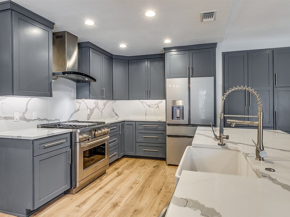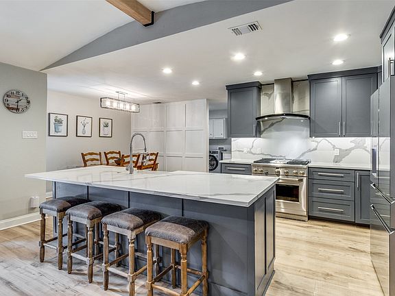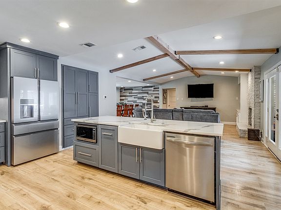Stunning updated 4-Bedroom, 3-Bathroom Ranch style home with Outdoor Living Oasis. 10x16 shed can be used for storage or flex space as it has electric. Interior is a bright, open floor plan and stylish finishes throughout. The gourmet kitchen boasts Quartz counters, stainless steel commercial appliances, including a 6-burner gas stove with center griddle, double-door refrigerator, commercial-grade vent hood, and a spacious kitchen island with breakfast bar. Enjoy an abundance of cabinets, drawers, and the large farm sink. The living area has ceilings with striking wood beams and recessed lighting, creating a warm and inviting atmosphere. A formal dining accent wall adds charm, front bedroom can also serve as an additional living space office etc with a second dining area in the kitchen. All four bedrooms are generously sized, including the primary suite featuring a walk-in closet and ensuite bathroom with double sinks and a walk-in shower. Outside, a circular driveway provides ample parking, while the backyard is a private retreat Tall cedar fence with electric gate and a sparkling pool and covered patio. This home combines modern design, functionality, and comfort in one exceptional package. Prime Dallas location minutes from Lakewood, close to downtown, White Rock Lake, NorthPark Mall, and walking distance from White Rock Trail. Make this your new home!