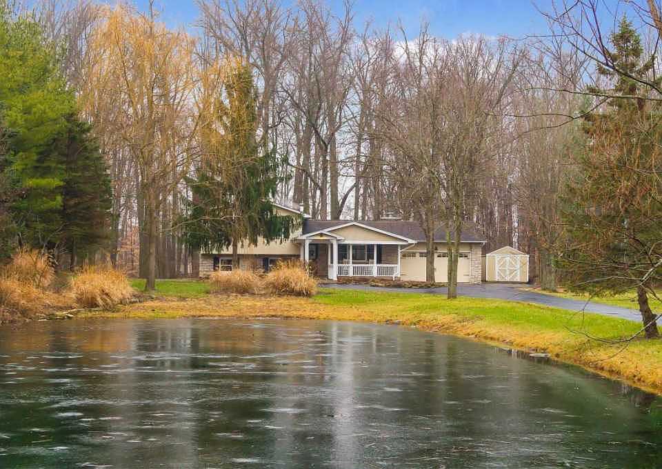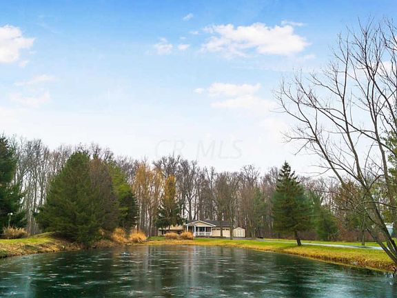 Country living minutes from Polaris. Property features 2.54 wooded acres w/large stocked pond, and 40x70 pole barn in Olentangy Schools. Set back off road, paved drive delivers you to covered front porch & circular drive. Inside newly remodeled, open-concept kitchen offers stunning amounts of storage, soft-close drawers, large center island, SS appliances and large dining space, all open into gracious 19x29 great room w/stone fireplace, double 3-light sliders open to screened porch, deck & patio. First floor also offers laundry & half bath. Down 1/2 flight stairs is master suite w/must-see walk-in shower, double vanity and California Closet. Down another 1/2 flight stairs finished rec room. Up 1/2 flight from main level are 2 bedrooms with newly remodeled full bath.