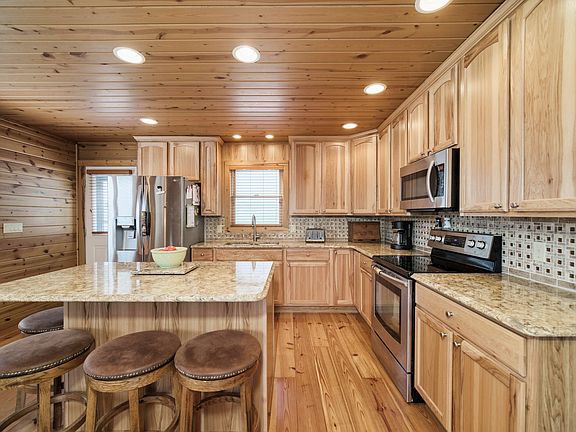Island with bar seatingWalk-out lower levelOpen floor planSandy beach frontageQuartz countertopsKnotty pine panelingHickory cabinetry
