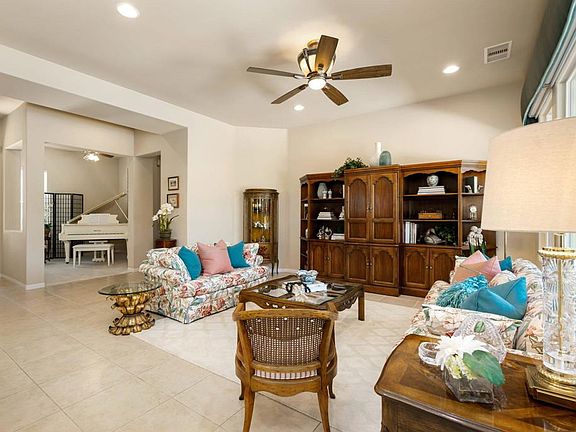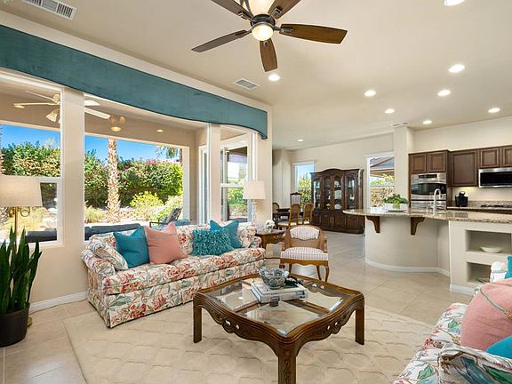 Motivated Seller! This popular CASPIAN model comes with garage AC and a owned SOLAR system integrated into the roof tiles. This home is a fresh take on tradition with an open great room, 2 bedrooms, 2 full baths plus a den that can be used as a home office or media room. Eighteen inch porcelain tiles extend throughout the common areas, New upgraded designer carpet complete the bedrooms and den. You'll find upgraded cabinets in the kitchen, slab granite counter tops with a prep island and bar. stainless steel appliances and a NEW LG refrigerator. The master bath has dual vanities, a spacious walk in closet and walk in shower with bench seat. This well maintained home includes remote solar shades in both the great room and master bedroom. The low maintenance rear patio with overhang is private and offers dramatic views of the Santa Rosa Mountains with beautiful sunsets.An oversized garage has an extra 4' garage extension with room for a golf cart or workshop. The upgraded stone exterior offers great curb appeal on this beautiful street in the 55+ Trilogy community where homeowners can enjoy all amenities that Trilogy has to offer, such as tennis, pickle ball, bocce ball, two pools, fitness center with walking track, meeting rooms, and much more. Come enjoy the good life at Trilogy LQ.