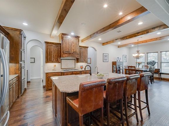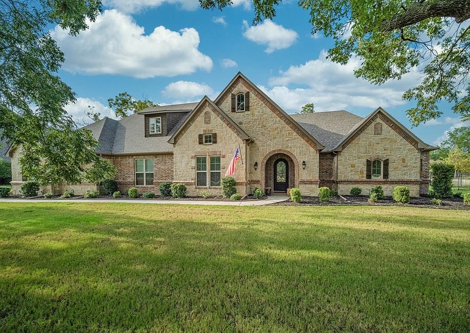 Gorgeous custom home in The Orchards, a Prestigious Gated Waterfront Community nestled among the trees & along Eagle Mountain Lake. Private beach & boat access! Fantastic single story home with mature pecan trees on MORE THAN ONE ACRE! Corner lot! Open layout with 4 beds, 3 full Baths, 3 car garage with storage. Whip up your favorite recipes in your gourmet kitchen with SS appliances, double oven, HUGE seated island, new gas Thermador cooktop, butler's pantry, granite! Oversized master bed & bath with granite & massive closet! Hand scraped hardwoods! Two living areas-one can be media or game room! Home office center! Large covered patio with fireplace! Room to entertain! Private Well, Septic means No WATER BILL