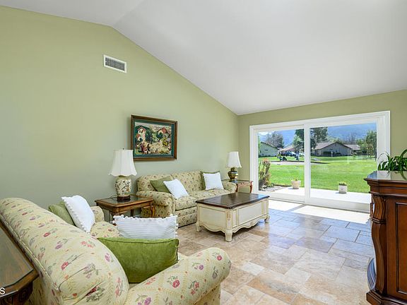 Absolutely stunning, expansive view of the golf course and a great location just a few doors from the Recreation Center. This home has 180 degree views of four holes on the lush golf course and also views of the beautiful Santa Monica Mountains in the backdrop. This is the popular El Dorado model in desirable Leisure Village, 55+, development with nearly 1500 square feet of living space, large living room, spacious open kitchen, formal dining room/area, den, 2 bedrooms and two baths. The kitchen has ample granite countertops and newer cabinets, stainless steel appliances and sink, recessed lights, pass-thru window to the patio, laundry ell with granite also and is open to the dining and living areas. The spacious living room has a 10' slider, giving a great view of the patio and golf course and beyond and leads to the more cozy den. The home has decorator colors throughout, smooth ceilings, dual pane windows, plantation shutters, wide baseboards and very attractive Versailles pattern - Tuscany Beige tile with the exception of the bedrooms where the carpeting has been recently replaced. The secondary bedroom has mirrored wardrobes, the Master is quite spacious with 2 mirrored wardrobes. The baths have been redone to include granite counters, brushed nickel fixtures and hardware and frameless clear glass shower enclosures, appealing neutral color tile and a shower seat in the Master. In addition, there the patio is attractively tiled and there is newer air conditioning. Leisure Village has 18 hole-par 3 golf, tennis, pool, spa, shuffleboard, library, multiple meeting rooms, wood shop, sewing room, lapidary room, ceramics shop, clubs and activities for most anyone's interest. This is Leisure Village golf course living at its best.
