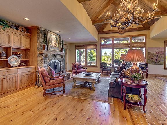 Stunning fully-furnished Bend retreat overlooking the Deschutes River gorge. Home has a great mix of formal & casual entertaining spaces all complete w/custom woodwork, built-ins & stone accents. Generous master on the main w/dedicated outdoor access. Three additional bedrooms, second living room & built-in office space upstairs. Enjoy the changing seasons on the beautiful back deck w/several seating areas & in-ground hot tub.