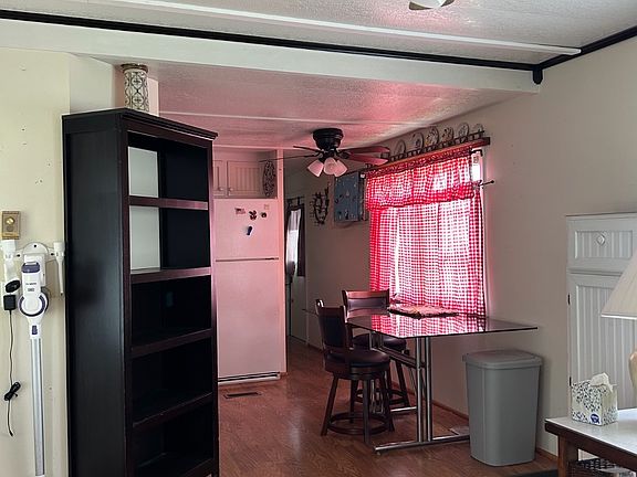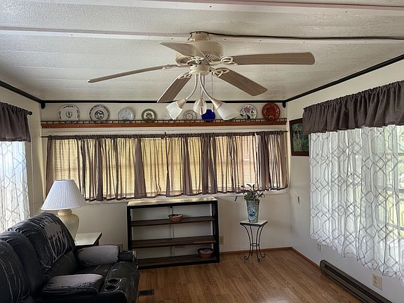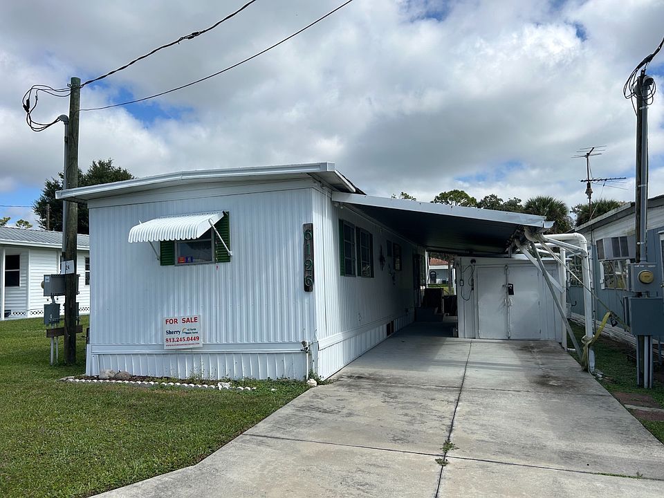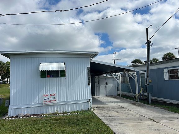 Whole home has laminate flooring. Living Room has lighted ceiling fan, and bay windows. Kitchen is open to living area. Kitchen has a dinette area with overhead window and lighted ceiling fan. Kitchen has a double stainless steel sink with track lighting, four burner glass top stove, microwave, refrigerator/freezer and tiled backsplash. Bedroom has wood laminate flooring and is very spacious with two closets, built in drawers, lighted ceiling fan and half bathroom. Main bathroom has tiled flooring, raised toilet with safety rail, tub/shower combo with safety rails, and linen closet. There is also a pantry located in the hallway off the kitchen as well as another storage closet in the living room room. Carport entry door has a retractable screen door. Outside of the home has a carport with two large sheds on a perimeter lot. Laundry with washer and dryer are located in one of carport sheds. PineCrest is a 55+ community conveniently located right off US 301/Gall Blvd. This home has a lot rent of $442 which includes water, sewer, trash, lawn care, and use of all amenities. Community amenities include clubhouse with game room ad billiards, laundry facility, and shuffle board courts. Please contact listing agent only for showings and more information.