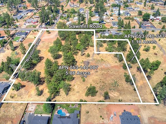 OPPORTUNITY IS KNOCKING!!! This property is made up of 2 separate parcels totaling 7.04 acres. Parcel 053-140-007 is 5.86 acres, zoned 2/3 RR & according to the seller, in previous conversations the Town of Paradise said it could potentially be re-zoned to half acre parcels, has a 2 inch AG meter and prior to the Camp Fire had a 3BD, 3BA, 2,988 sq.ft. home. Parcel 053-140-047 is 1.18 acres, zoned TR 1/3 and has never been developed. The property sits well off of Sawmill Road; borders Boyden Lane and Sawmill Road. Very unique opportunity to own 7.04 level acres in the middle of town.