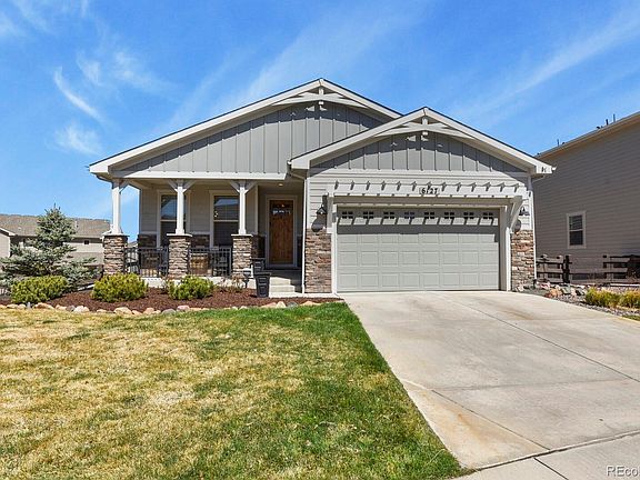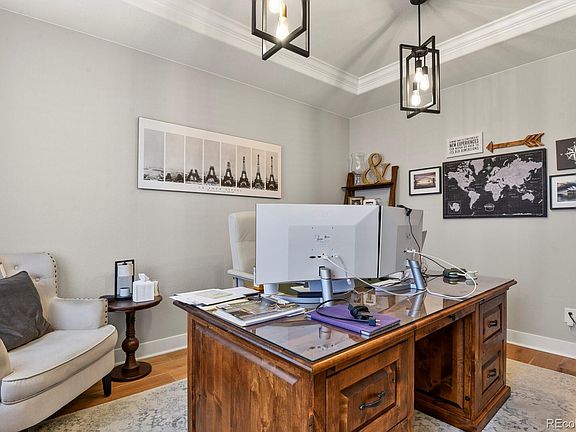 There is no detailed unturned in this 2020 Toll Brothers Haywood model in the highly sought after North Hill neighborhood. Right from the upgraded front door you will be impressed by the custom features that have been added to this home. Entering the home you will be greeted by the custom office doors as well as the wood flooring that flows through the expansive main floor. The kitchen features high-end appliances, an oversized island, and modern backsplash. The main floor primary bedroom provides privacy and ease of living while also hosting a gorgeous private bathroom and large walk-in closet. This luxurious suite has vaulted ceilings and a fireplace. All of the walk-in closets throughout the house have been equipped with high quality closet organizers. Upstairs there is a loft and two bedrooms each of which has their own bathroom. After touring the upper two levels of the home, your jaw will drop when you walk into the basement. The massive bar island is truly a show stopper and the gorgeous fireplace will provide warmth and charm to the whole space. The island contains two beverage fridges and a sink. The fourth bedroom is located in the basement and is located perfectly by the three-quarter bathroom. Please any guest with the stunning modern shower and finishes. Step out of the walkout basement and find a professionally landscaped backyard that is made to entertain. The built-in outdoor kitchen is luxurious and features a built-in Blackstone, Traeger Smoker, and gas grill. Enjoy the comforts of convince located near this home; just minutes from Topgolf, the Denver Premium Outlets, and Orchard Town Center’s excellent shopping and dining options.