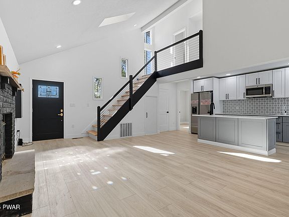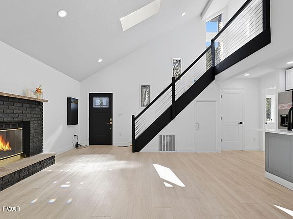 Cozy wood-burning fireplaceHigh-end finishesBrand-new windowsStunning fully renovated homeRainfall showerNatural lightBreathtaking lake views