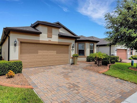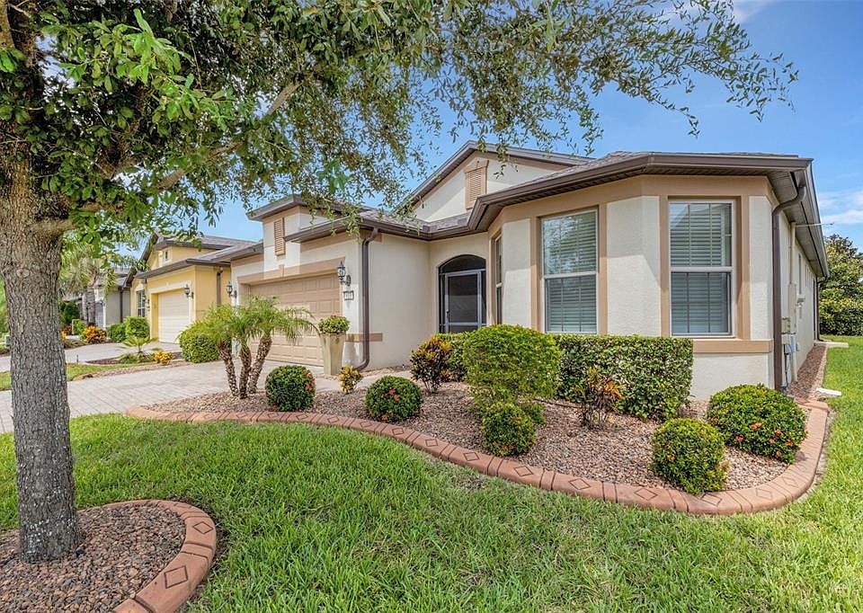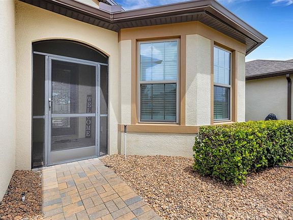 Located in the desired 55+ RESORT-STYLE community of Del Webb Orlando, this Beautiful Summerwood floor plan is a MUST SEE! This home features 2 bedrooms + a den, and 2 bathrooms. You walk into the screened front porch and through the decorative front door into the open floor plan. The guest bedroom with bay window and bathroom are in the front of the home. The heart of the home, the kitchen, features stainless steel appliances including a NATURAL GAS STOVE, lower cabinet pull-outs, granite countertops, a backsplash, a large island perfect for entertaining, and a spacious pantry. The PRIMARY BEDROOM is in the rear of the home for owner privacy and features a tray ceiling. The primary bathroom suite features double sinks with granite countertops, a large walk-in tiled shower, and a large walk-in closet. The dining room is conveniently located adjacent to the kitchen. The large living room features large glass sliding doors that open to the covered lanai with an additional screened cage and NATURAL GAS HOOK-UP. The large laundry room includes a utility sink and built-in cabinets. The 2-car garage includes a tandem space for golf cart parking or extra storage. The garage includes built-in storage cabinets. The additional home features include updated lighting and ceiling fans, newer carpet in the bedrooms, and a NATURAL GAS hot water heater. The exterior of the home features a paver driveway, gutters and concrete landscaping curbing. The $277 monthly Del Webb HOA fee includes exclusive access to resident-owned 30,000+ SF Montecito clubhouse and amenities. DEL WEBB ORLANDO is a 55+ community with a tavern, indoor walking track, fitness center, indoor and outdoor pools and spas with locker rooms and showers, billiards, ping pong, craft room, and a ballroom for special events. Outdoor activities include pickleball, tennis, bocce, basketball, shuffleboard, community gardening center, an outdoor amphitheater, large brick fire pit and large screened-in gazebo over the water. Miles of biking and walking trails within Ridgewood Lakes gated community. The $425 semi-annual HOA fee provides 24x7 staffed security gate and master association-owned private road maintenance. Adjacent to recently renovated 18-hole White Heron Golf Club. Community is located conveniently to shopping at Posner Park (4 miles), Disney World, Universal Studios, Orlando & Central FL.