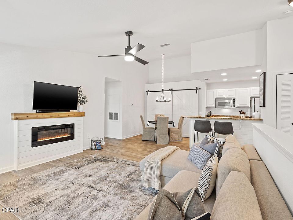 Large pantryVaulted ceilingsShiplap fireplaceBarn doors