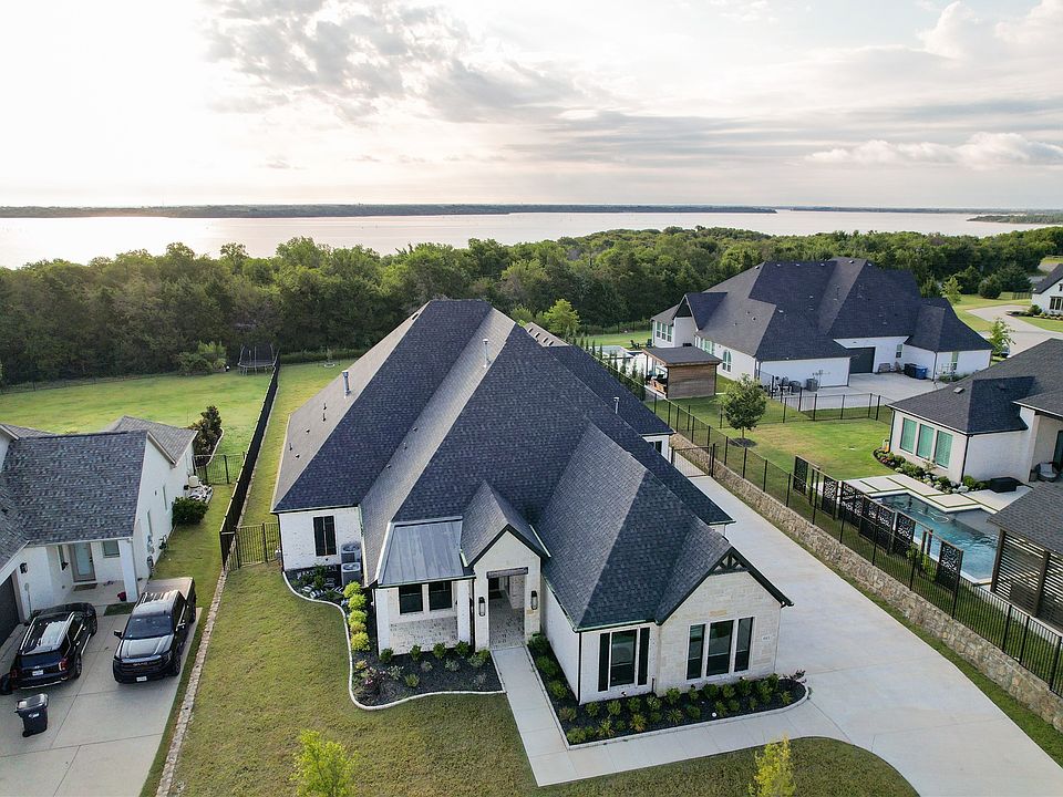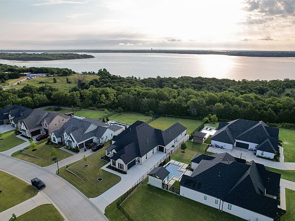 Stunning Modern Home in Prestigious Brockdale Estates located within the highly acclaimed Lovejoy ISD, this exquisite property offers a rare combination of elegance, functionality, and scenic beauty-with Lake Lavon adjacent to your backyard. A private mother-in-law suite with its own kitchen, living room, bonus room, laundry, bedroom, bathroom with frameless showerdoor, and separate garage entry makes this home ideal for multigenerational living or hosting extended guests in comfort and style, complete with an extended driveway for convenience. Inside, the open floor plan is filled with natural light pouring through expansive windows showcasing rich dark hardwood floors, beamed vaulted ceilings, custom built-ins, and a striking floor to ceiling tile like marble fireplace in the main living area. The chef’s kitchen is an entertainer’s dream, featuring a massive waterfall-edge marble island, stainless steel appliances, 6 burner gas stove, double ovens, marble backsplash, designer lighting, abundant custom cabinetry, and a large walk-in pantry with custom cabinets. The open floor plan extends to the large formal dining room with designer chandelier. The primary suite is a serene retreat with tray ceilings, oversized windows framing backyard views and a luxurious en-suite bath complete with dual vanities, large frameless glass shower with rainhead, a soaking tub, and a spacious walk-in closet with shelving-plus a built-in safe room for peace of mind. Additional highlights include a media room with tray ceilings and upgraded Cat 6 wiring, dedicated office with French doors, enclosed sunroom, dual garages with EV plugs, two tankless water heaters, fire sprinkler system, and a security system for modern comfort and efficiency. Set on a half-acre lot with a large covered patio and plenty of grassy space for play and entertaining, and backed by a tree-lined landscape leading toward Lake Lavon, this home perfectly blends modern sophistication with natural serenity.