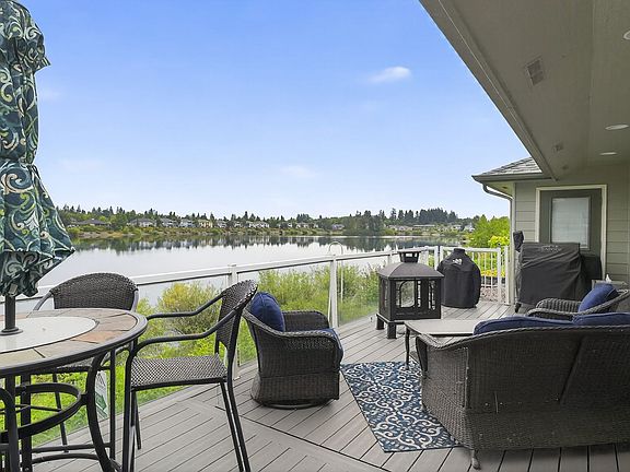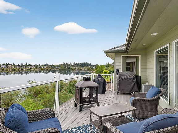 Open Saturday (9/27) 11am-1pm. Stunning lakefront ranch with unobstructed views of Staats Lake! Skylights and floor to ceiling windows offer lots of natural light throughout. Vaulted living room features gas fireplace and slider to deck. Beautiful hardwood floors in living room, dining room, and office. Spacious kitchen has island, Viking stainless steel appliances, and eating bar. Primary bedroom includes fireplace, exterior doors to deck and courtyard, and bath with jetted tub and double sinks. Two additional bedrooms + office on main floor. New roof. Expansive Composite deck with glass railing is the perfect spot for entertaining. Peaceful fully fenced courtyard on side of home with lake views. Desirable neighborhood with easy access to walking path around lake.