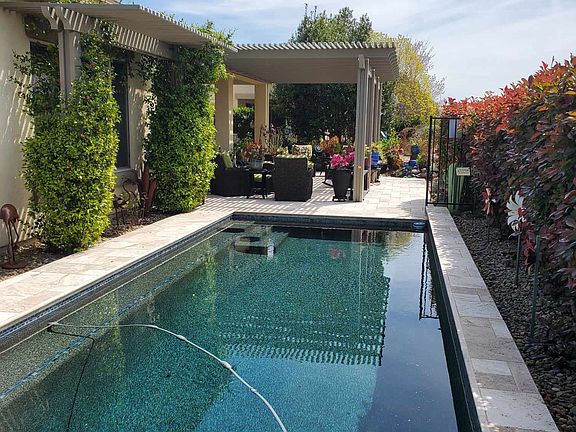 The surface around the patio and pool is honed travertine stone with ample shaded areas for seating and dining while overlooking the greenery of the "open space" yard;