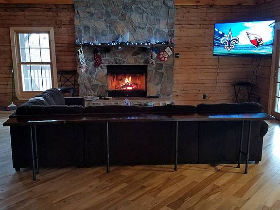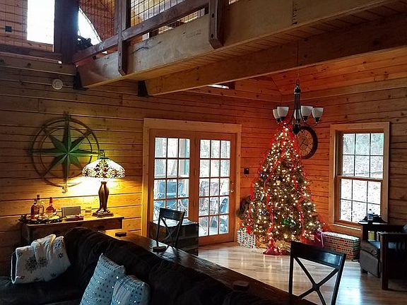 This is a log lake home with large wrap around deck. It has a beautiful rock fireplace and open stair case with upstairs spaces connected by bridge.It has a very nice kitchen. This property sits just across from boat ramp.
