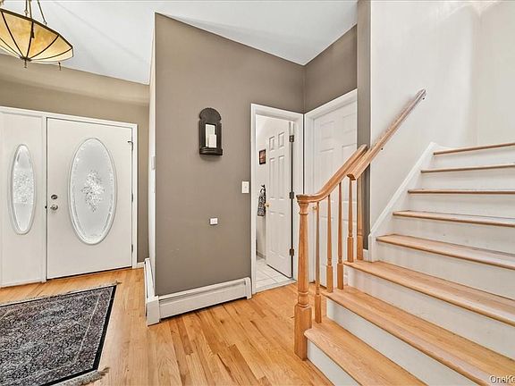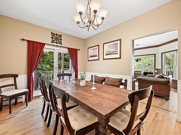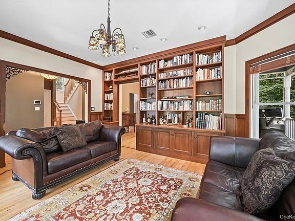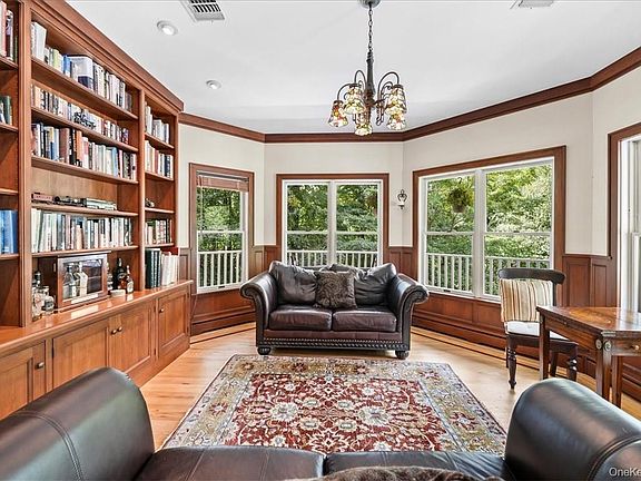 Discover tranquility and timeless elegance in this young Victorian-style gem, offering over 3,000 square feet of exquisite living space. Perfectly nestled behind a charming white picket fence in the sought-after rivertown of Piermont, NY, this home captivates with its picturesque wrap-around porch and breathtaking seasonal views of the Hudson River. Step inside to find soaring ceilings, sunlit spaces, and a thoughtfully designed floor plan that blends classic character with modern comfort. The formal living room welcomes you with walls of windows, cherry-inlay hardwood floors, and custom built-in cabinetry, creating an elegant yet inviting atmosphere. Adjacent, the dining room opens through glass sliders to the wrap-around porch—perfect for alfresco entertaining. At the rear of the home, the cozy family room exudes warmth with its stone fireplace and large picture window that seamlessly connects the indoors with the surrounding natural beauty. French doors lead to a spacious deck, ideal for morning coffee or evening gatherings. The expansive, hilly backyard offers privacy, stunning scenery, and endless possibilities for outdoor enjoyment. The chef’s kitchen is the heart of the home, featuring a butcher-block island, custom cabinetry, and a wall of windows that fill the eat-in area with natural light. A powder room and laundry/mudroom with direct access to the two-car garage (with soaring ceilings) complete this main level. Upstairs, you’ll find four generous bedrooms plus a flex space suited for a home office, gym, or studio. The primary suite is a serene retreat, with sweeping Hudson River views through a large picture window. Its spa-like ensuite bath offers a double vanity, soaking tub, and walk-in shower, while the custom walk-in closet provides ample storage and organization. The front southern bedroom impresses with cathedral ceilings and a wall of windows, and the northern bedroom connects to the versatile bonus room—ideal for a guest suite, playroom, or private office. The unfinished lower level offers exceptional potential, with high ceilings, daylight windows, and sliders to the side yard—ready to be transformed into your dream space. Enjoy the best of Piermont living just moments from the Hudson River, shops, cafés, waterfront walking trails, and vibrant local eateries. Conveniently close to the Village of Nyack, the New Jersey border, and major commuting routes. This home perfectly blends river town charm with everyday convenience.