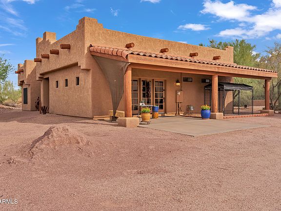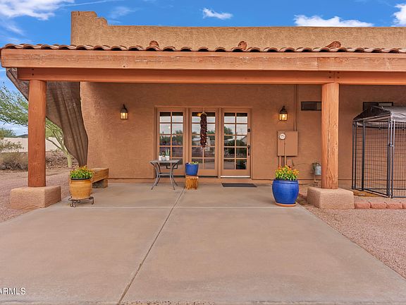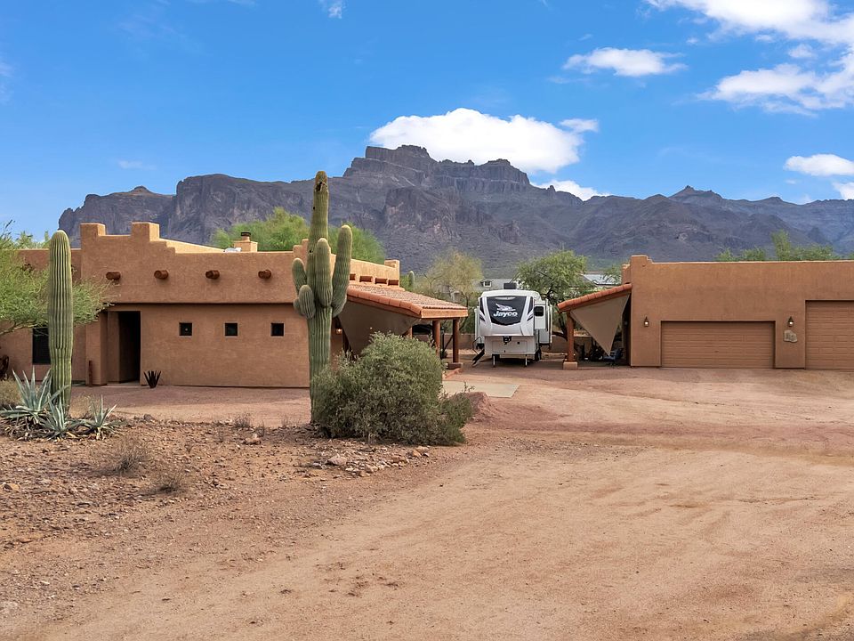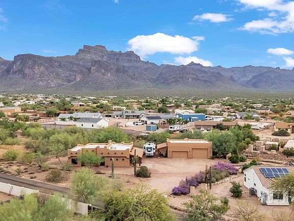 Bask in unobstructed Superstition Mountain views from this immaculate 3-bed, 2-bath home on 1.15 private acres at the end of a quiet street. Thoughtfully maintained with inviting tile & vinyl flooring, a cozy fireplace, and a JennAir kitchen perfect for cooking and gathering. The primary suite features a spacious ensuite bath. Enjoy the outdoors with a block-walled yard, shade, lemon & lime trees, and soft exterior lighting. A 4-car garage with its own tiled bathroom adds comfort for guests, hobbies or workspace. Two HVAC systems and 50-amp RV hookup provide convenience and flexibility. Tranquil desert living just minutes to amenities and adventure.
