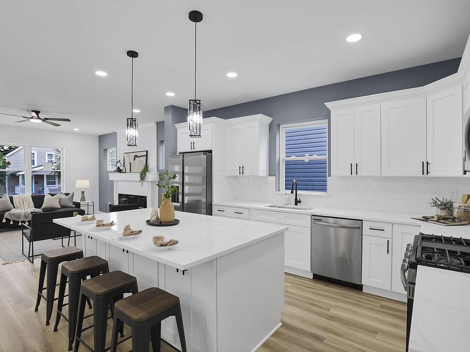 Welcome to this modern new-build in Ganther's Place! This open floor plan home features luxury vinyl plank flooring throughout, a modern kitchen with stainless steel appliances, granite countertops, ample storage, and a large island that flows into the spacious living and dining areas. The first floor also includes a half bathroom and convenient laundry room. Upstairs, the vaulted owner's suite offers a full bath and walk-in closet, along with two additional bedrooms and a full bath. The finished basement provides even more living space with a large rec room, wet bar, full bathroom, and an additional bedroom. Outside, enjoy a fenced yard and a detached 2-car garage—perfect for added privacy and storage. Ask about the builder incentive!