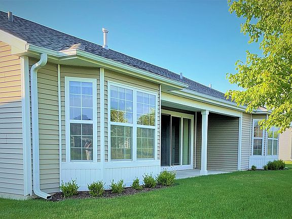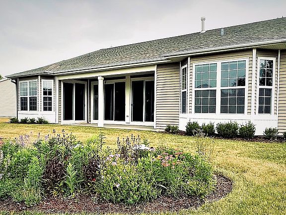 Somerset style. Spacious central living and dining. Large den/office off of front entryway. Gas fireplace. Ceramic tile in front hall, kitchen, utility room and both bathrooms. Kitchen has cherry cabinets with natural finish, and a bump-out bay window offering more space and views. The main bedroom also offers a bump-out bay window featuring a view of the flower garden island. This property has lovely, custom landscaping and easy access to a walking path. Most rooms, closets, and the garage have been freshly painted. The house includes all of the appliances. The roof was replaced in 2021.